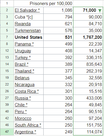 "en": "<p>A list of the large countries sorted by the incarceration rate, how many people it keeps in jail. The US is in some remarkable company: El Salvador, Cuba, Rwanda, Turkenistan, Panama, Uruguay...<br>Source: <a href=\"https://en.wikipedia.org/wiki/List_of_countries_by_incarceration_rate\" target=\"_blank\" rel=\"nofollow noopener noreferrer\" translate=\"no\"><span class=\"invisible\">https://</span><span class=\"ellipsis\">en.wikipedia.org/wiki/List_of_</span><span class=\"invisible\">countries_by_incarceration_rate</span></a></p>"