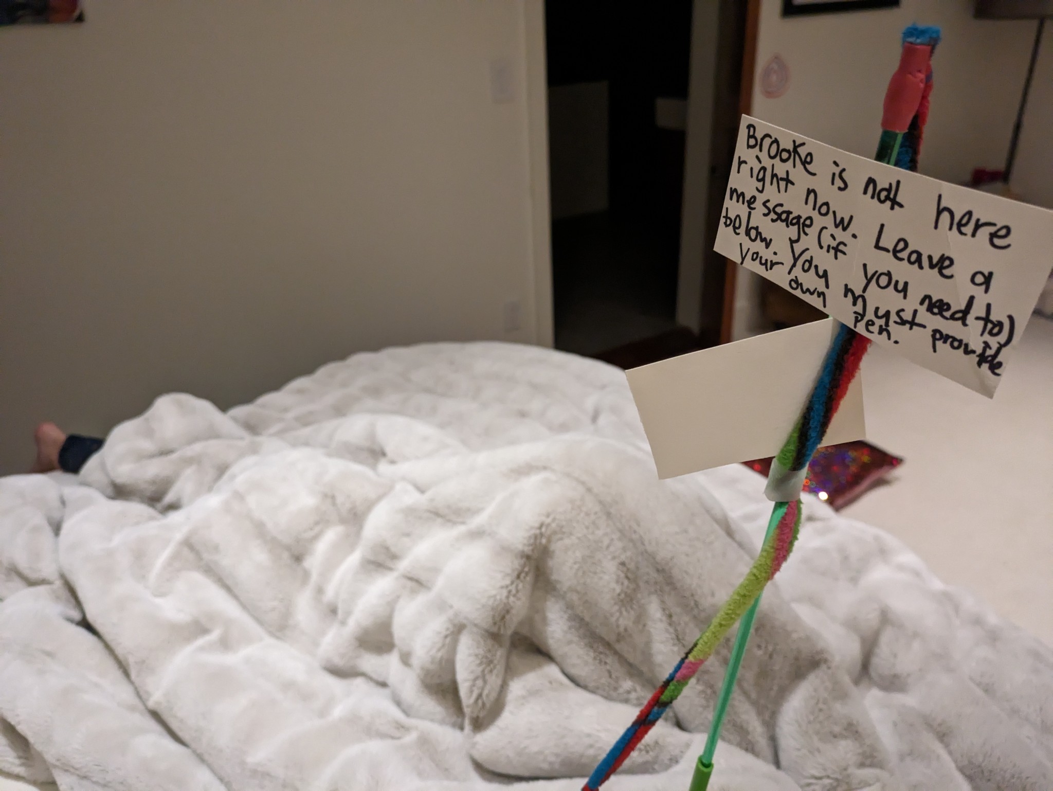 "alt": "Sign on bed that says \"Brooke is not here right now. Leave a message (if you need to) below. You must provide your own pen.\" A foot is poking out from under the covers.",